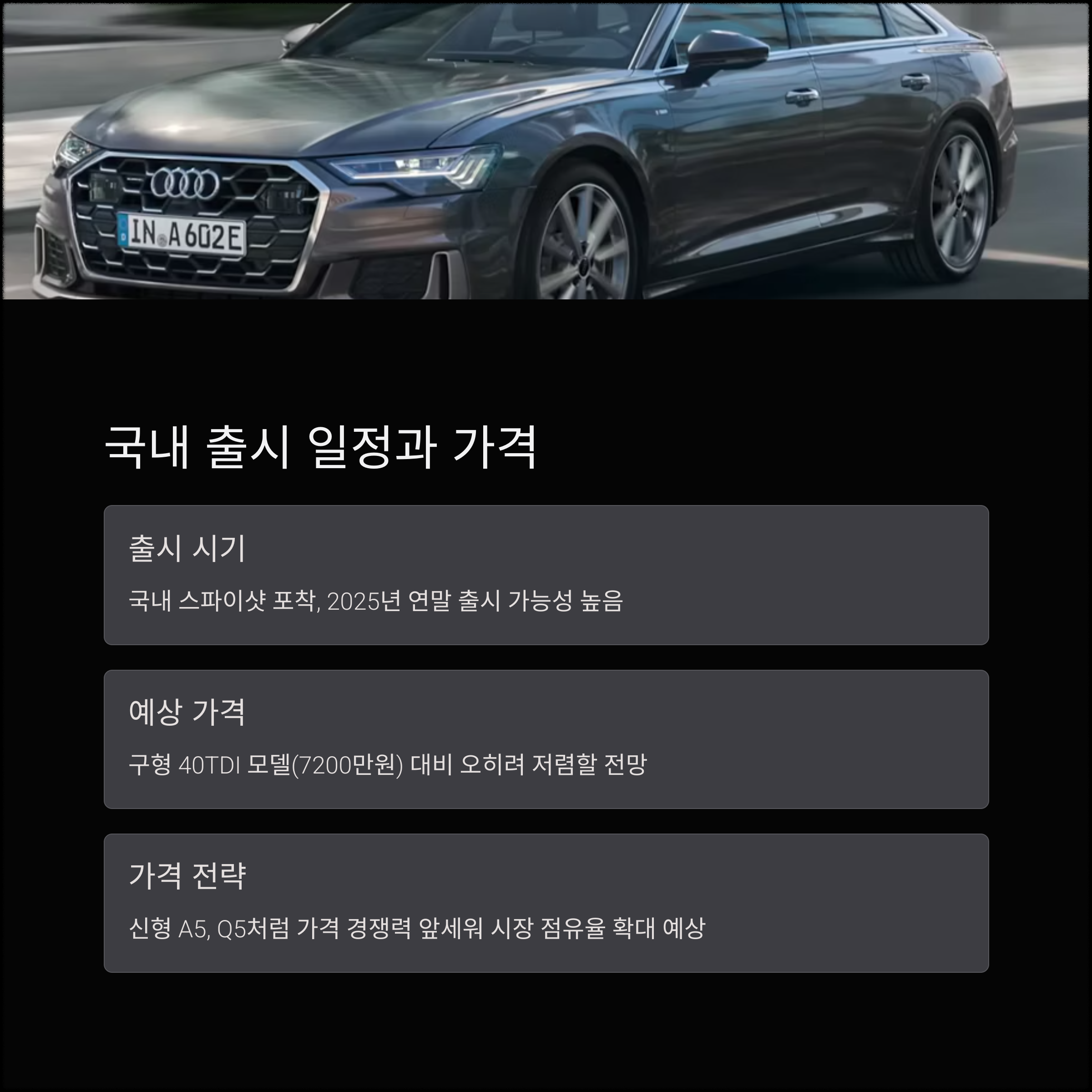최근 출시된 신형 A5와 Q5가 구형 대비 저렴한 가격을 보여준 것처럼, A6 역시 가격 경쟁력을 앞세워 시장 점유율 확대에 나설 것으로 보입니다.