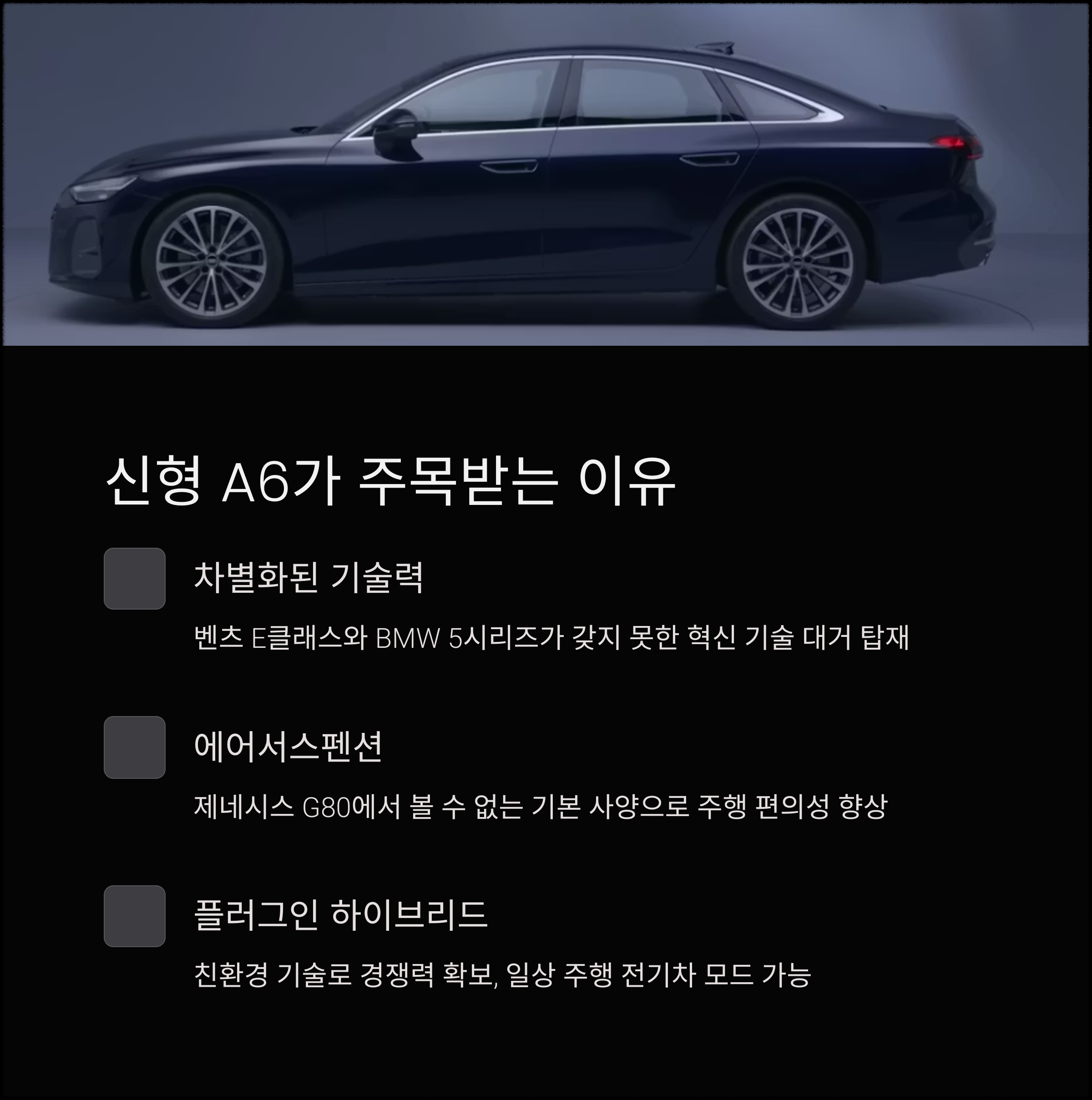 아우디 신형 A6는 기존 벤츠 E클래스와 BMW 5시리즈가 가지지 못한 차별화된 요소들을 대거 투입하여 중형 프리미엄 세단 시장에서의 경쟁력을 크게 강화했습니다. 특히 제네시스 G80에서는 볼 수 없는 에어서스펜션과 플러그인 하이브리드 시스템을 기본 제공하여 기술적 우위를 확보했습니다.