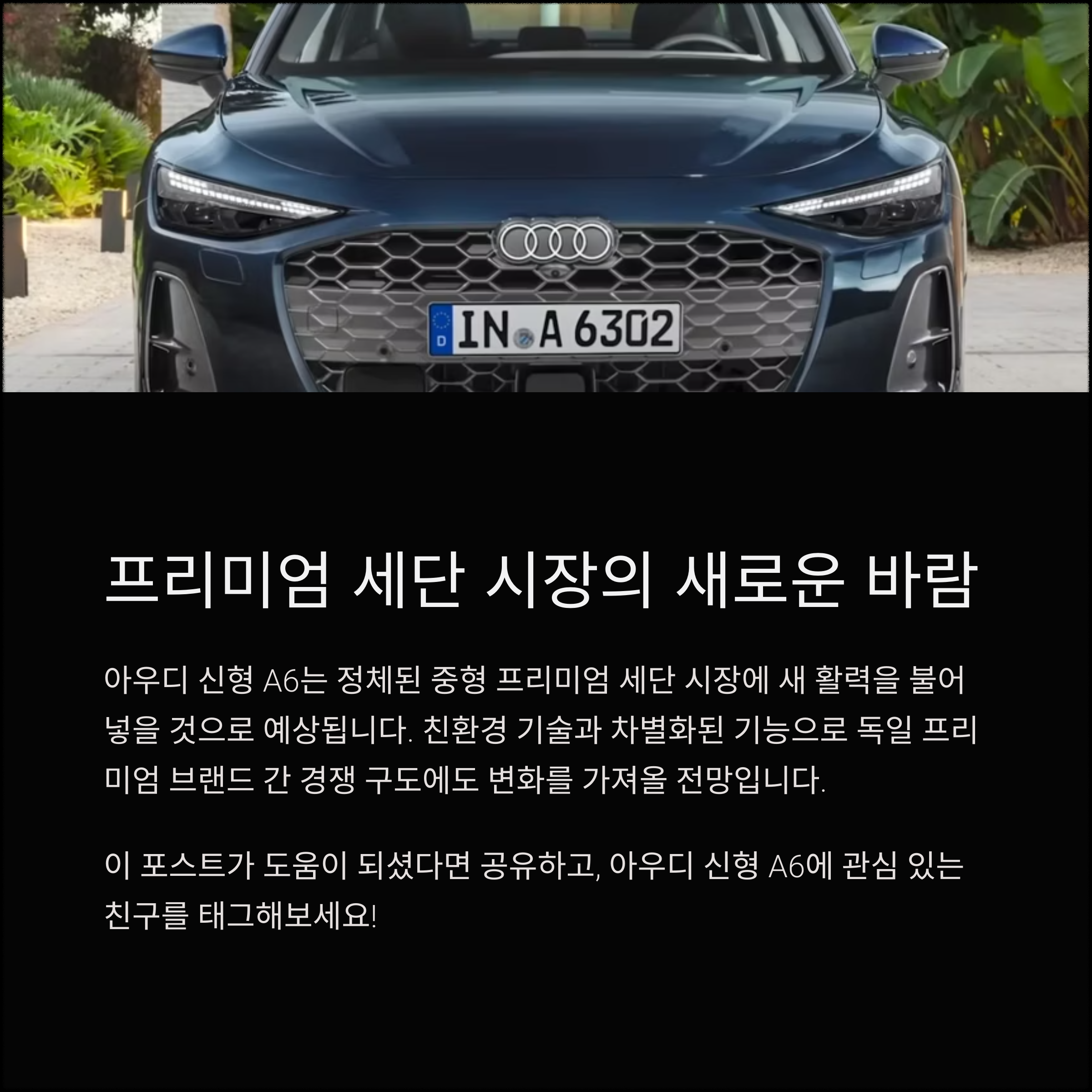 신형 A6의 성공 여부는 최종 출시 가격과 국내 소비자들의 반응에 달려있지만, 현재까지 공개된 스펙과 기술력을 고려할 때 충분한 경쟁력을 갖추고 있다는 평가입니다.