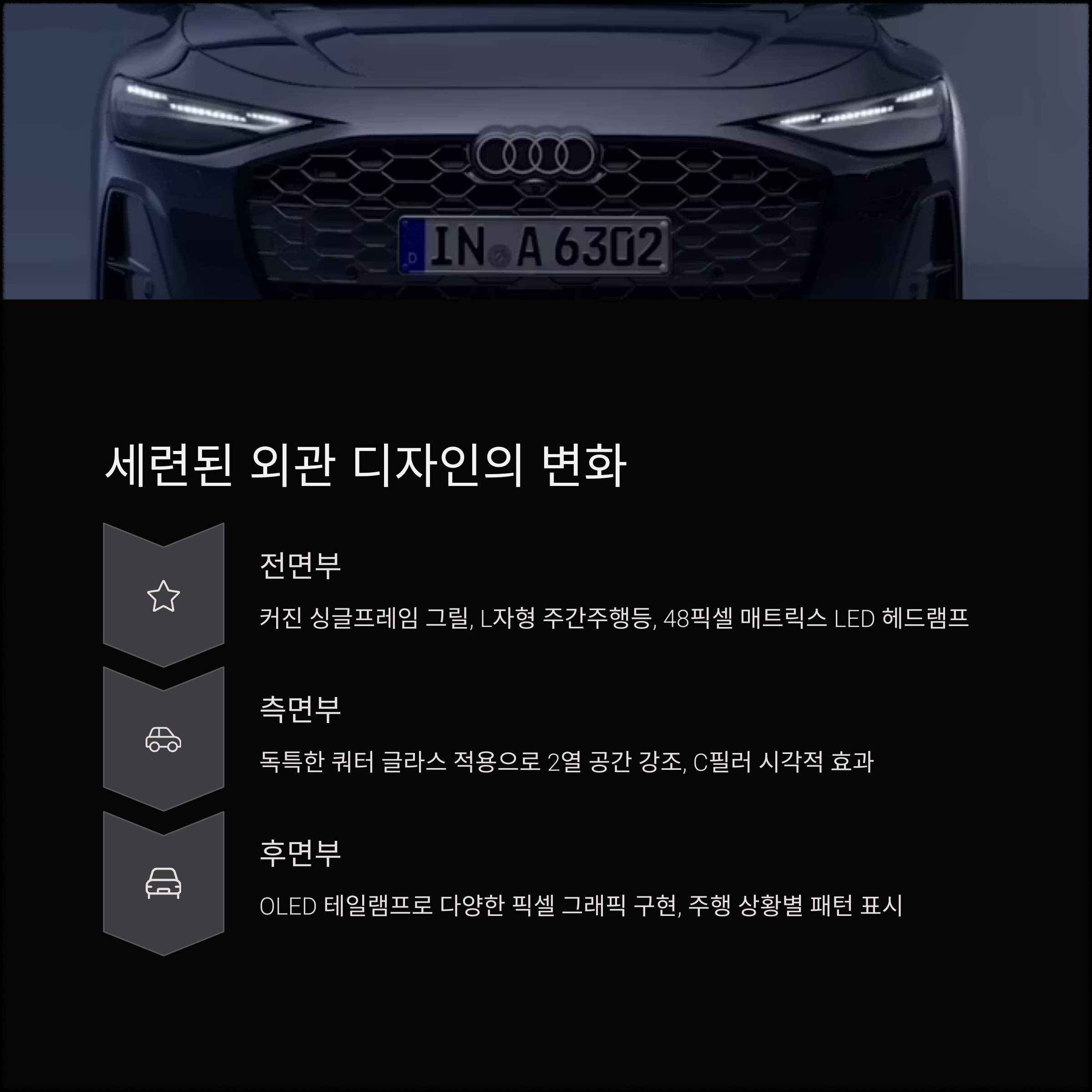 신형 A6의 외관 디자인은 이전 모델 대비 훨씬 세련되고 역동적인 모습으로 변화했습니다. 전면부에는 더욱 커진 싱글프레임 그릴과 L자 형태의 주간주행등이 적용되었으며, 헤드램프에는 48개 픽셀로 구성된 매트릭스 LED 기술이 탑재되어 웰컴 세리모니 기능을 제공합니다.
