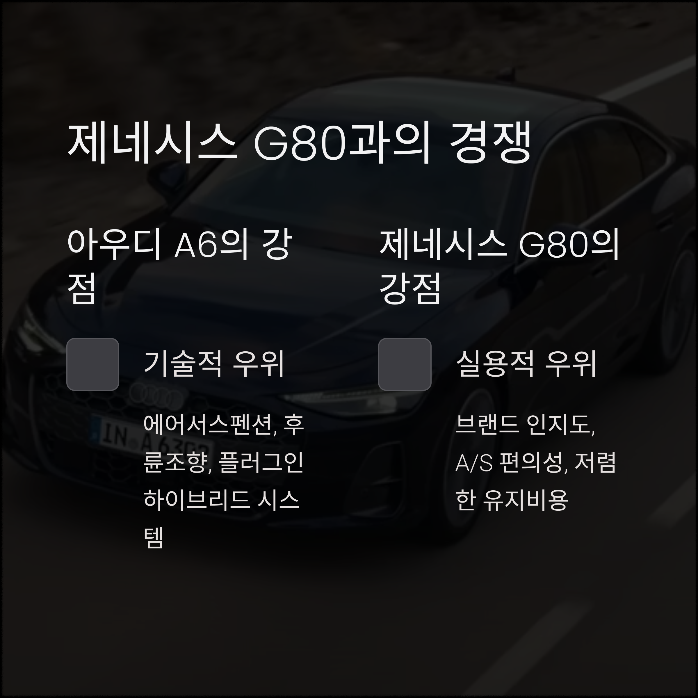 신형 A6는 제네시스 G80가 가지지 못한 여러 기술적 우위를 보유하고 있습니다. 에어서스펜션, 후륜조향, 플러그인 하이브리드 시스템 등은 G80에서는 선택할 수 없는 옵션들입니다.