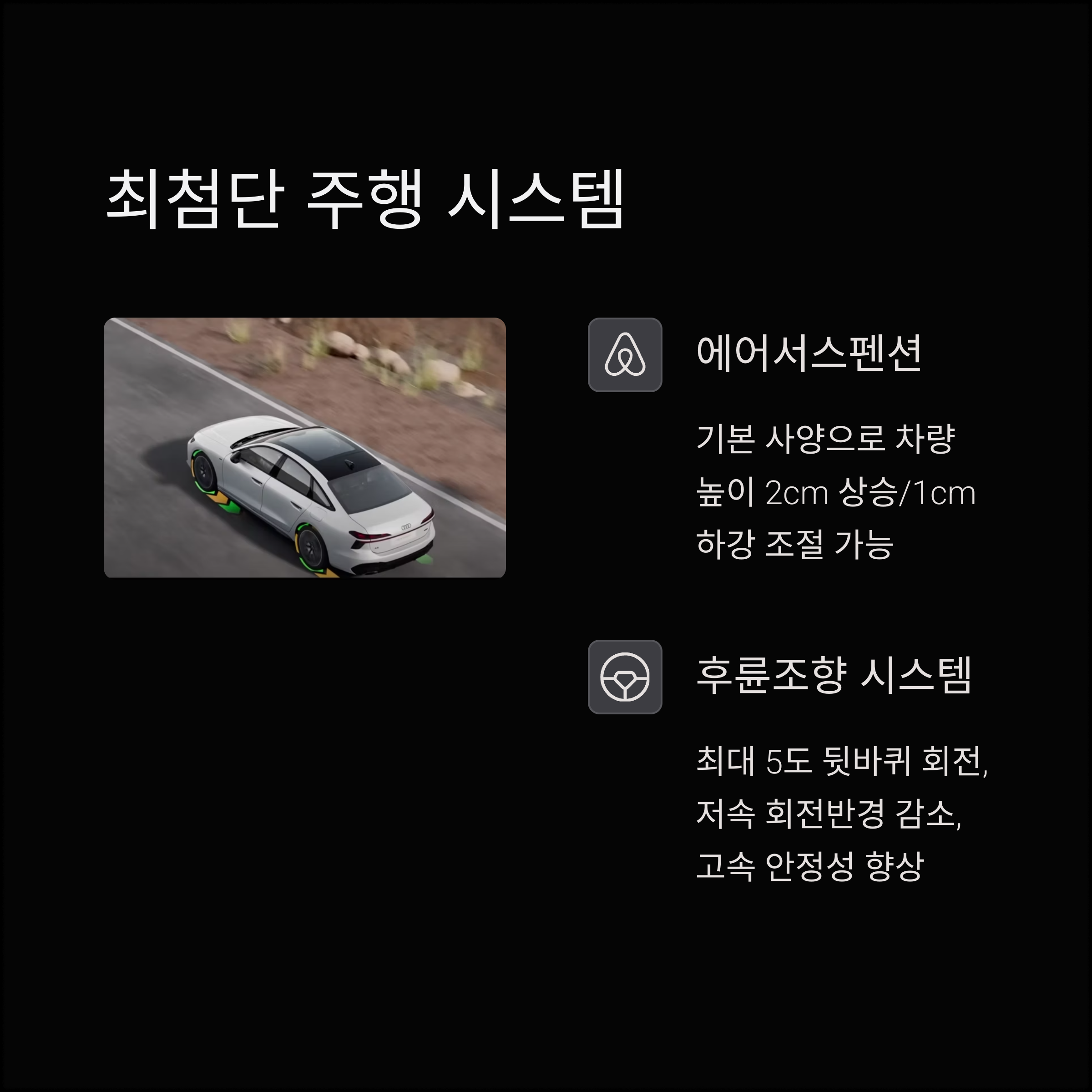 제네시스 G80에서는 제공되지 않는 에어서스펜션이 신형 A6에는 기본 적용됩니다. 이 시스템은 차량 높이를 2cm 상승 또는 1cm 하강시킬 수 있어 주행 상황에 따른 최적의 세팅이 가능합니다.