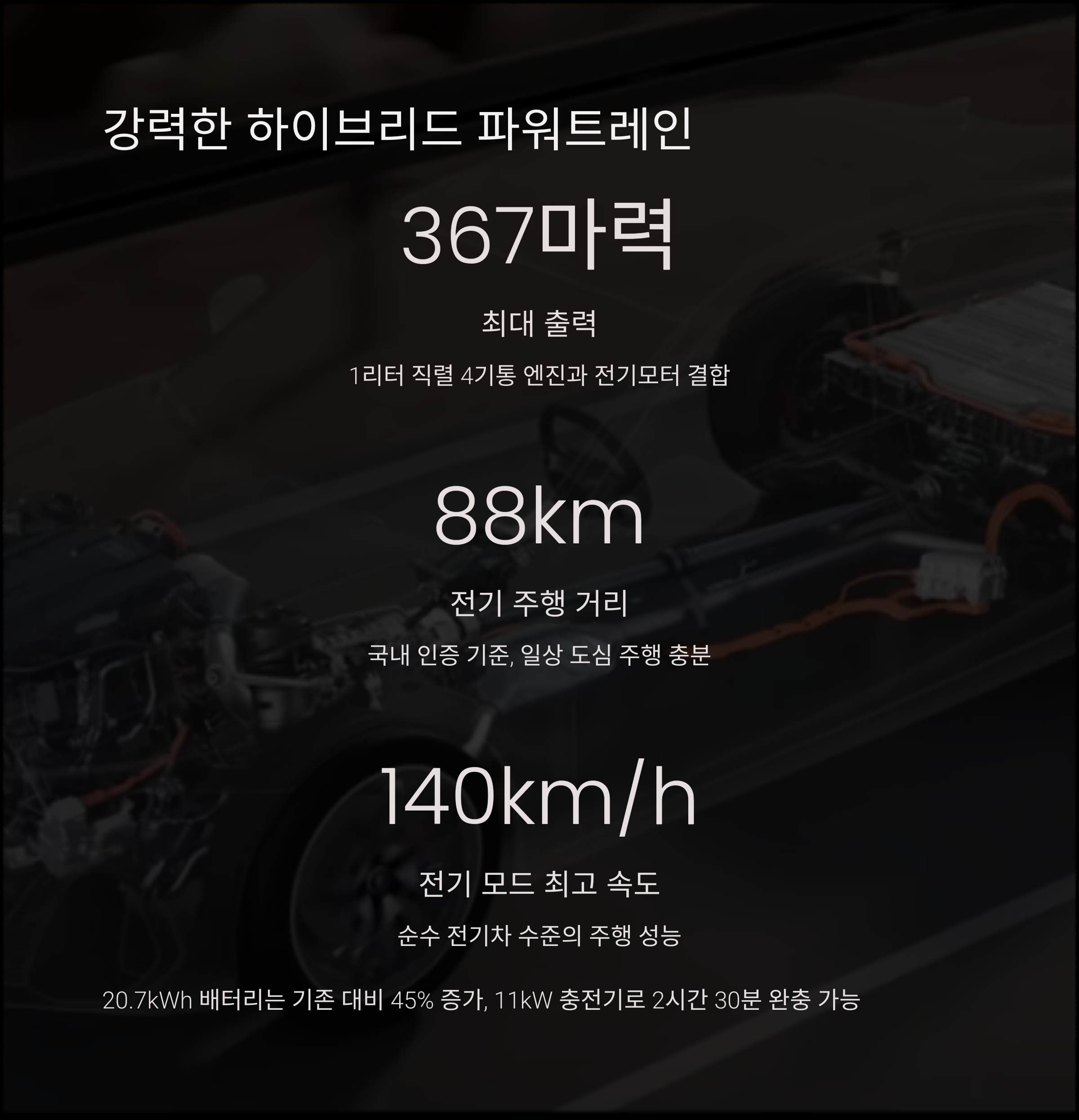 배터리 용량은 기존 모델 대비 45% 증가했으며, 완충 시 유럽 기준 111km, 국내 인증 기준 약 88km의 순수 전기 주행이 가능합니다. 이는 일상적인 도심 주행에서는 순수 전기차처럼 사용할 수 있는 수준입니다.