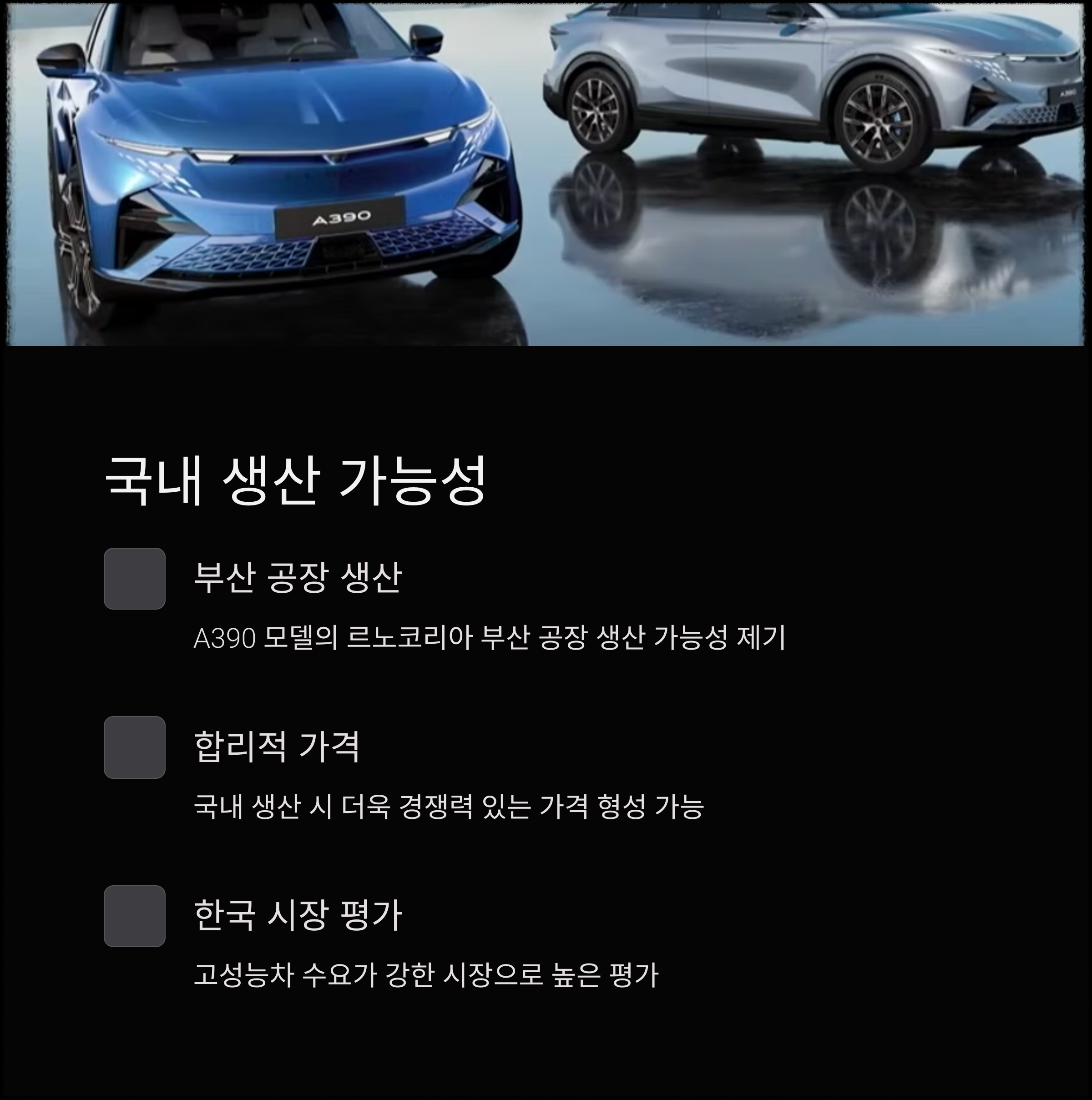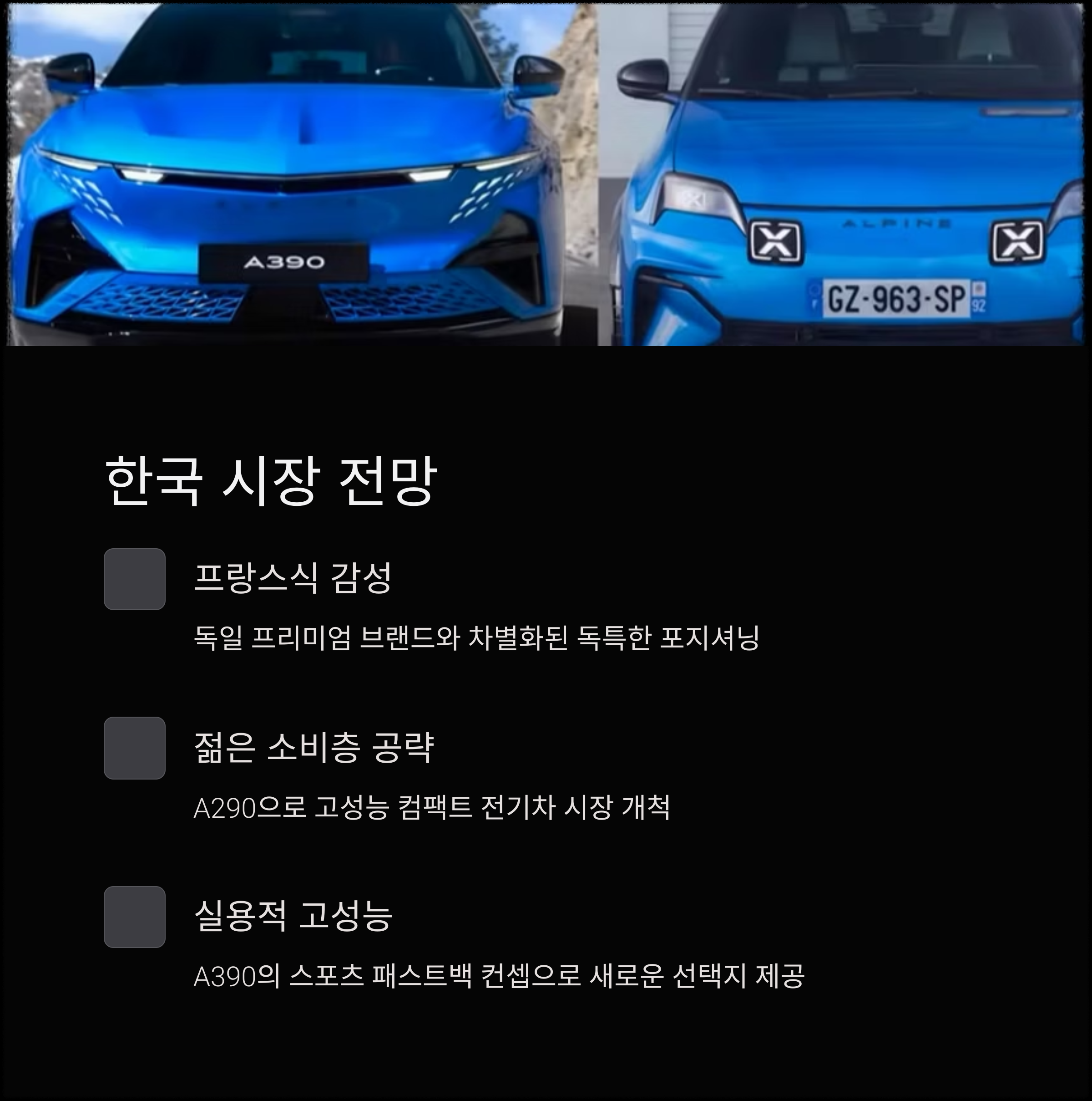 알핀 CEO는 한국을 고성능차 수요가 강한 시장으로 평가하며, 첫 출시 모델로 A290과 A390을 유력 후보로 언급했다. 특히 한국의 전기차 인프라 발달과 고성능차에 대한 소비자들의 관심 증가가 알핀의 진출 결정에 큰 영향을 미쳤다.