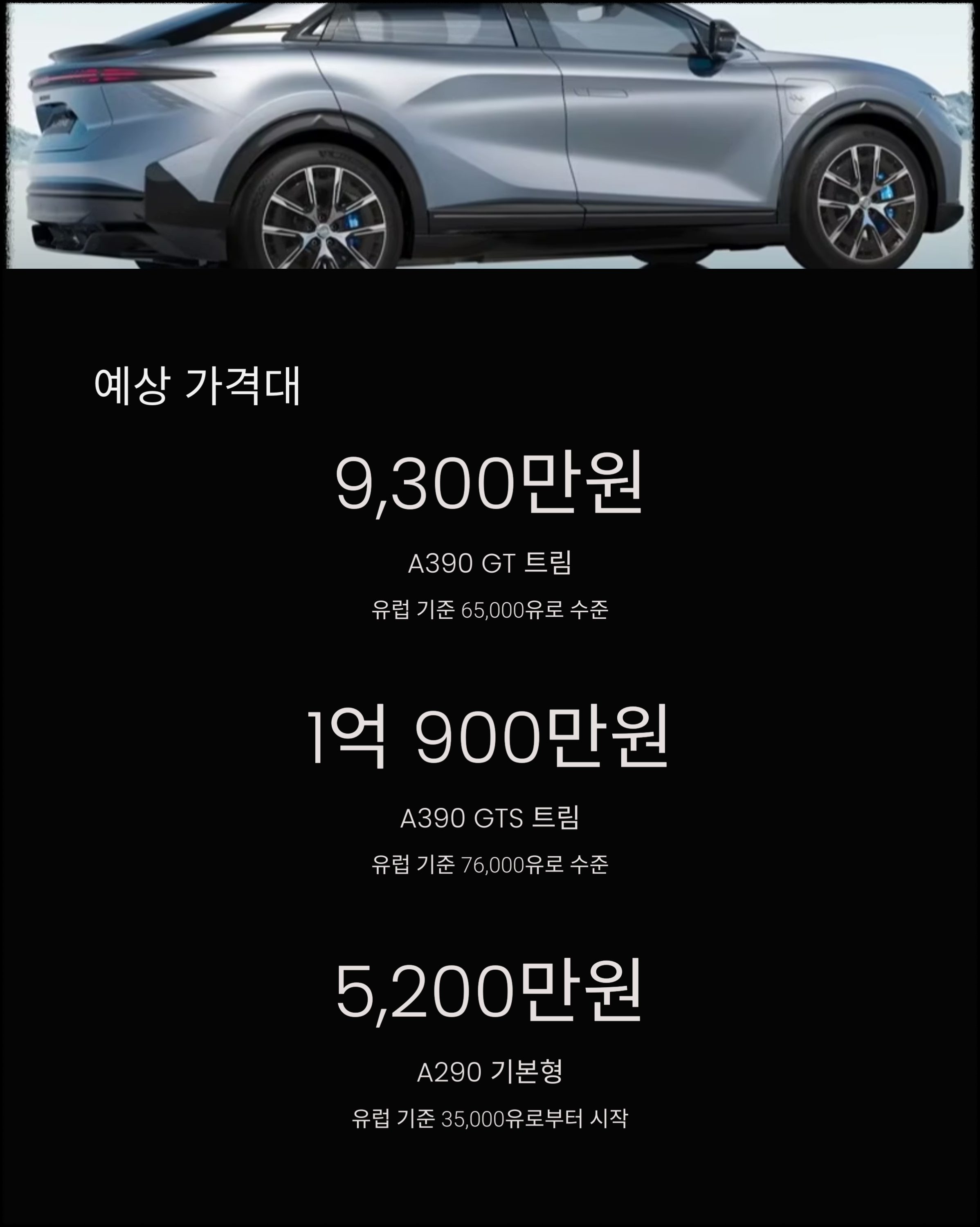 A390의 경우 유럽 기준으로 GT 트림은 약 65,000유로, GTS 트림은 약 76,000유로로 예상된다. 이를 국내 가격으로 환산하면 GT 트림은 약 9,300만 원, GTS 트림은 약 1억 900만 원 수준이 될 것으로 보인다. 고성능 전기 SUV 시장에서는 경쟁력 있는 가격대로 평가된다.