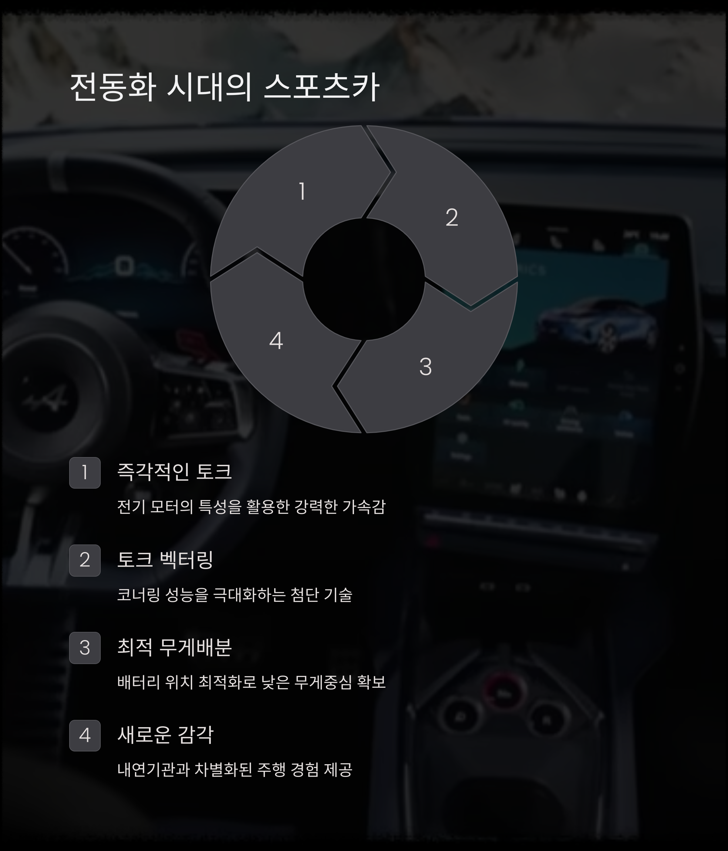 알핀은 2026년부터 모든 모델이 전동화를 추진하는 대표적인 브랜드로, 전기차 시대에 맞는 새로운 스포츠카 경험을 제시하고 있다. 기존 내연기관 스포츠카의 한계를 극복하고, 전기 모터의 즉각적인 토크 특성을 활용한 새로운 주행 감각을 제공한다.