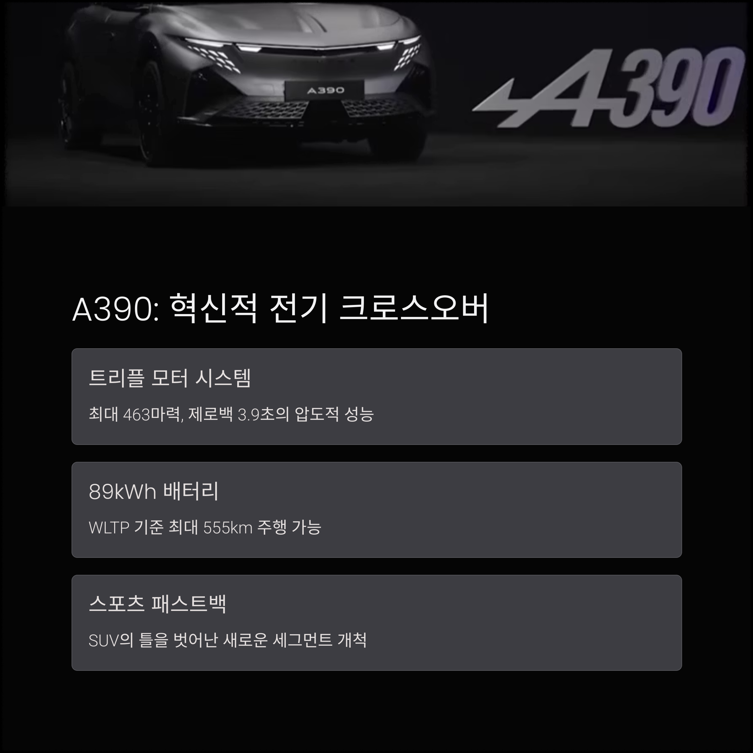 A390 역시 기존 고성능 전기 SUV 시장에서 독특한 스포츠 패스트백 컨셉으로 차별화를 시도할 수 있다. 실용성과 성능을 모두 추구하는 국내 소비자들의 니즈에 부합하는 모델로 자리잡을 가능성이 크다.
