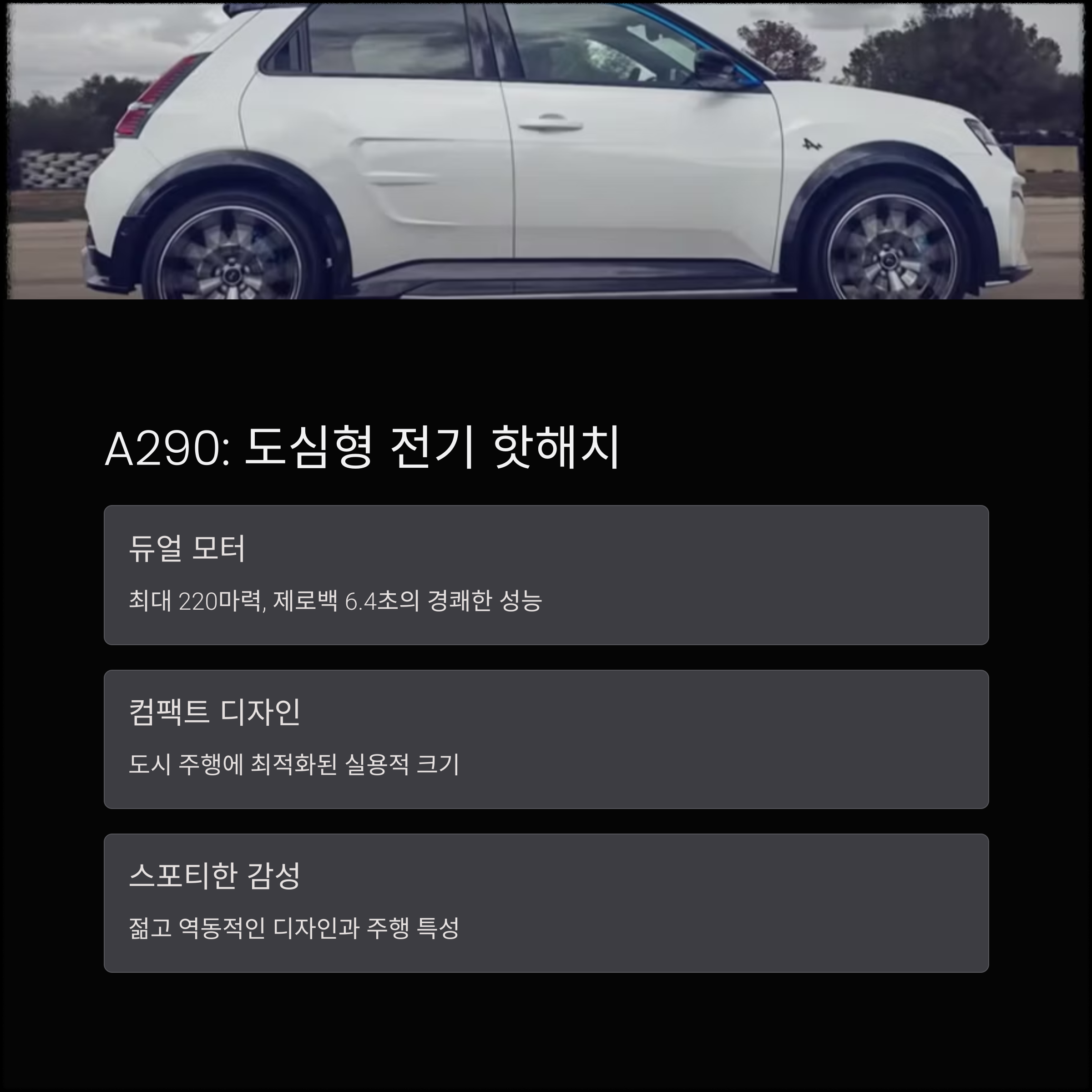 A290은 알핀의 첫 번째 전기 핫해치 모델로, 도시 주행에 최적화된 컴팩트한 크기와 스포티한 성능을 제공한다. 르노 5 E-테크 일렉트릭과 동일한 AmpR Small 플랫폼을 기반으로 하지만, 알핀만의 고성능 튜닝이 가미되어 차별화된 성능을 구현한다.