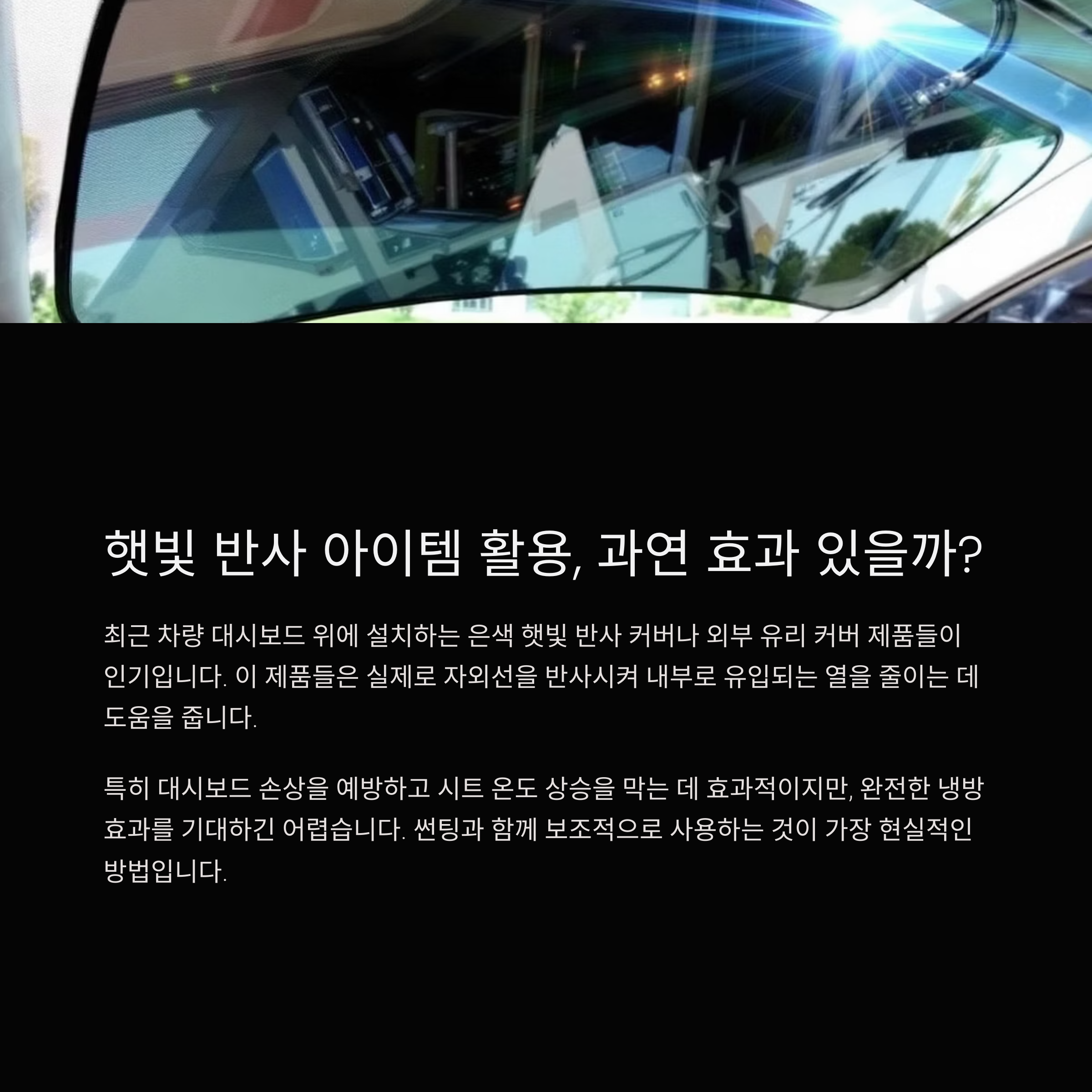 최근 차량 대시보드 위에 설치하는 은색 햇빛 반사 커버나 외부 유리 커버 제품들이 인기입니다. 이 제품들은 실제로 자외선을 반사시켜 내부로 유입되는 열을 줄이는 데 도움을 줍니다. 특히 대시보드 손상을 예방하고 시트 온도 상승을 막는 데 효과적입니다. 다만, 완전한 냉방 효과를 기대하긴 어렵기 때문에 썬팅과 함께 보조적으로 사용하는 것이 가장 현실적인 방법입니다. 출근 전 주차된 차량이 뜨거워지는 것을 줄이고 싶다면 차량 외부 커버 제품을 함께 사용해보세요.