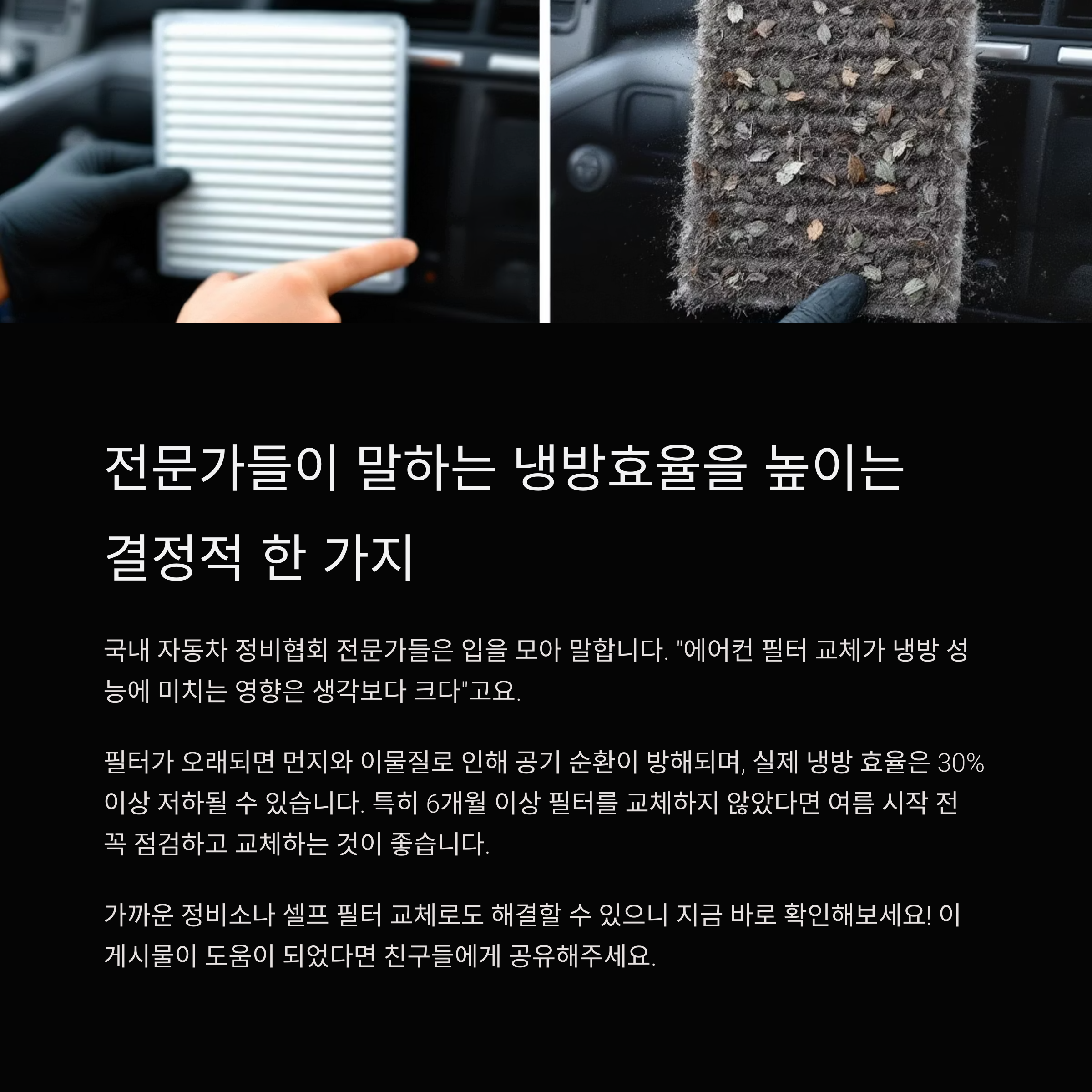 국내 자동차 정비협회 전문가들은 입을 모아 말합니다. "에어컨 필터 교체가 냉방 성능에 미치는 영향은 생각보다 크다"고요. 필터가 오래되면 먼지와 이물질로 인해 공기 순환이 방해되며, 실제 냉방 효율은 30% 이상 저하될 수 있습니다. 특히 6개월 이상 필터를 교체하지 않았다면 여름 시작 전 꼭 점검하고 교체하는 것이 좋습니다. 이건 누구나 쉽게 실천할 수 있는 행동입니다. 가까운 정비소나 셀프 필터 교체로도 해결할 수 있으니 지금 바로 확인해보세요.
