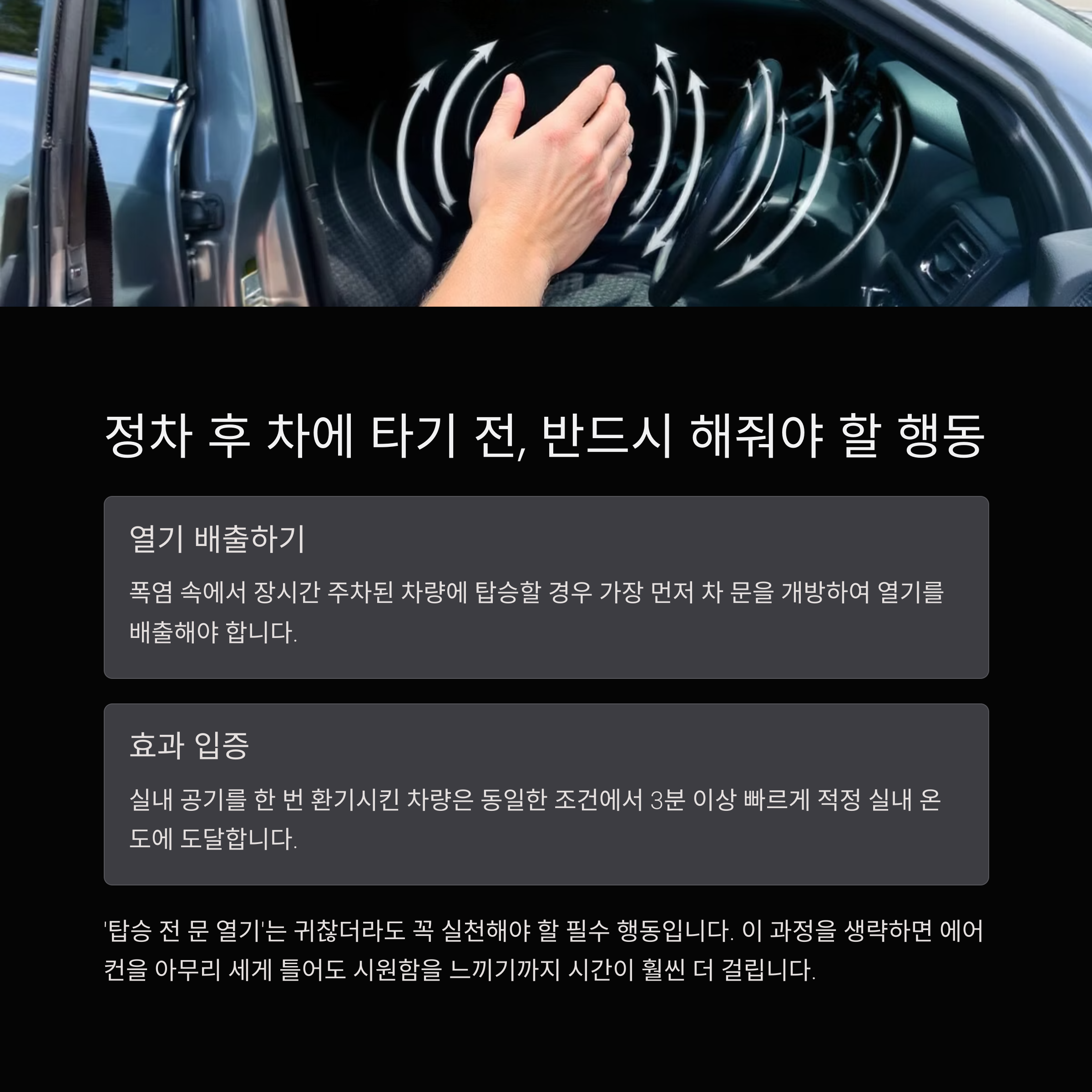 첫째, 차량 문을 전부 열고 1~2분간 내부 뜨거운 공기를 배출하세요. 이때 선루프나 트렁크도 함께 열어주면 효과는 더 큽니다.