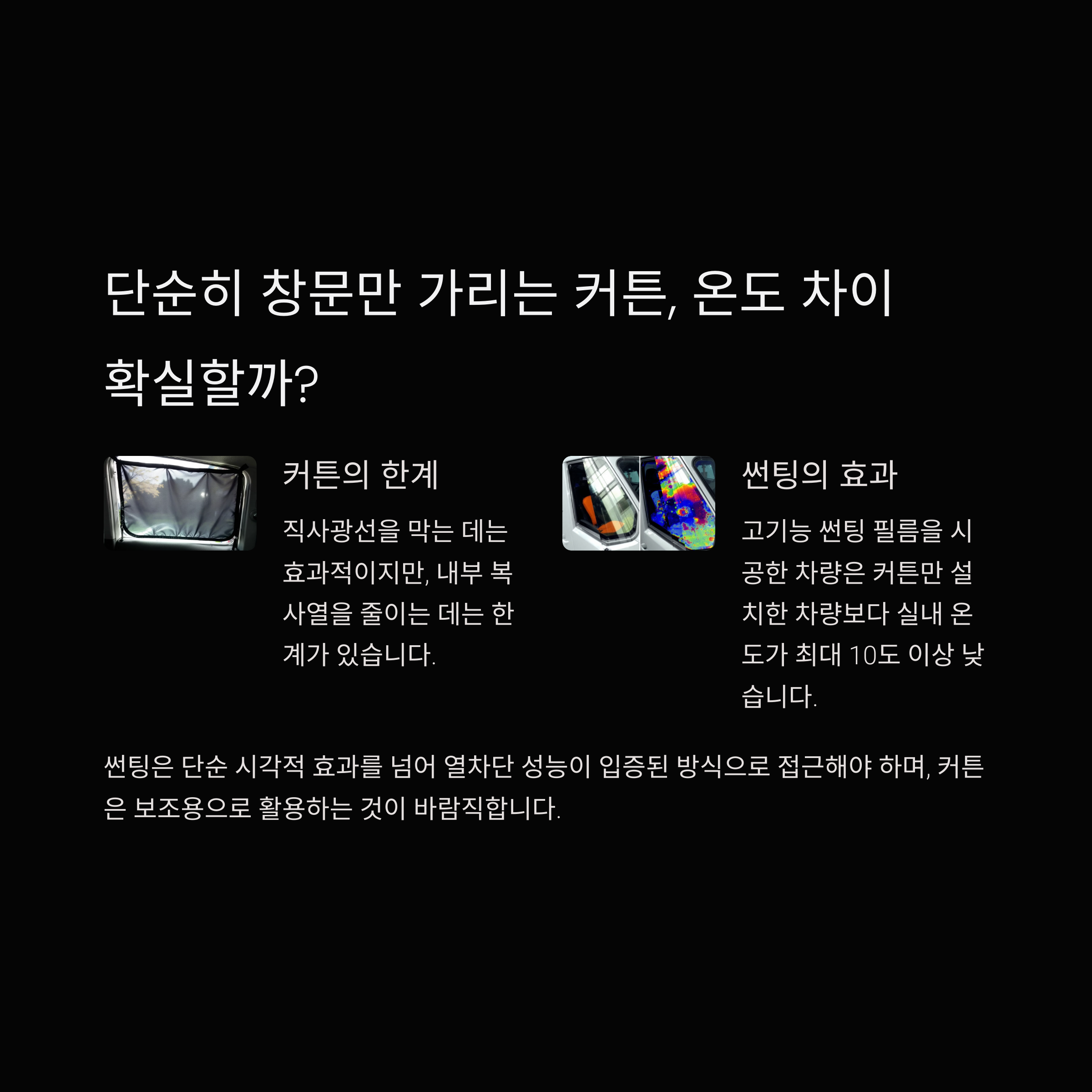 많은 분들이 간편하게 햇빛 가리개나 커튼을 사용하곤 합니다. 이는 직사광선을 막는 데는 효과적이지만, 내부 복사열을 줄이는 데는 한계가 있습니다. 실제 실험 결과, 커튼만 설치한 차량과 고기능 썬팅 필름을 시공한 차량 간 실내 온도는 최대 10도 이상 차이가 나는 것으로 나타났습니다. 즉, 썬팅은 단순 시각적 효과를 넘어 열차단 성능이 입증된 방식으로 접근해야 하며, 커튼은 보조용으로 활용하는 것이 바람직합니다.