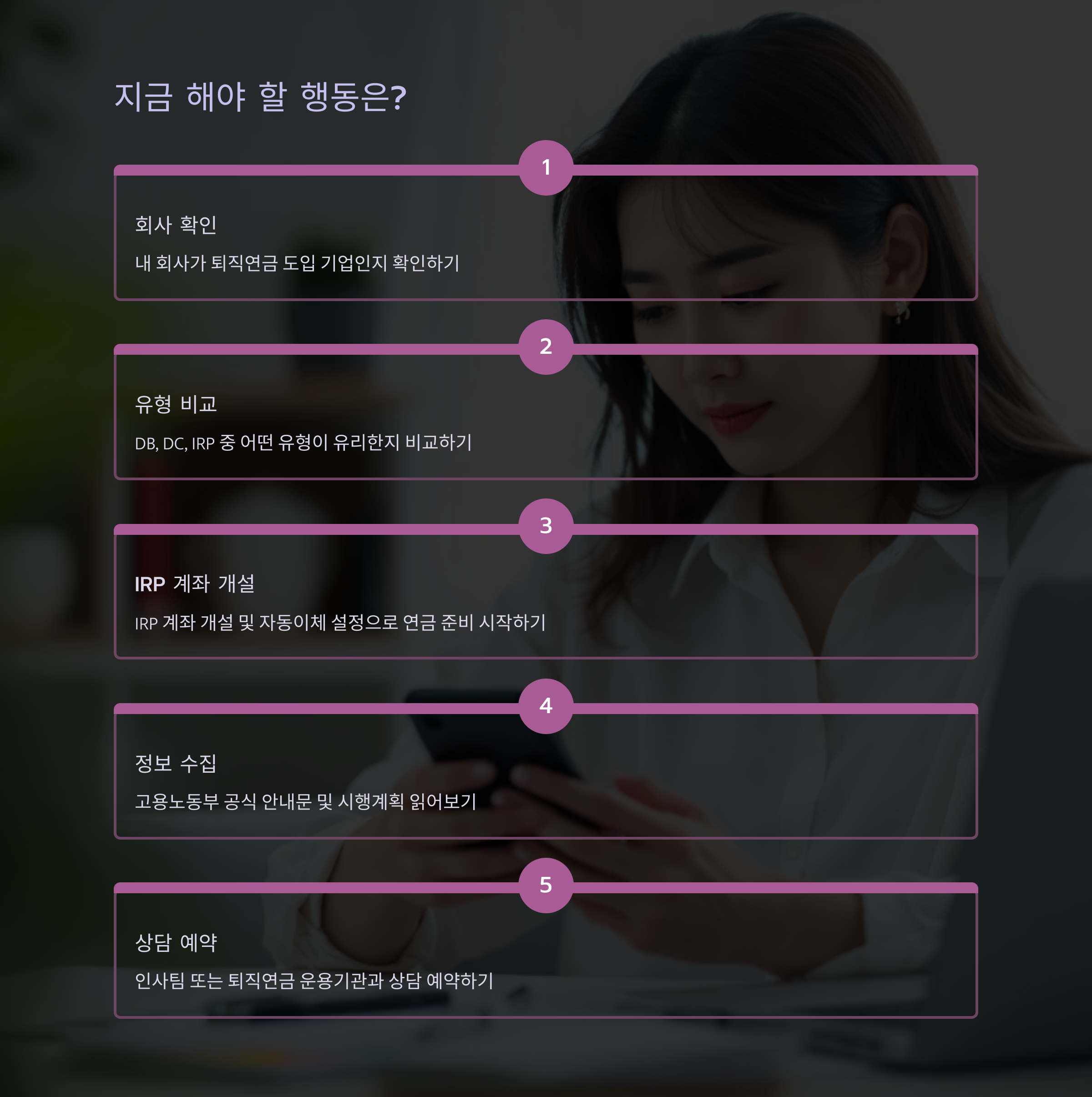 지금 당장 할 수 있는 행동으로는, 본인의 회사가 어떤 퇴직연금 제도를 운영 중인지 확인하고, 내 퇴직금이 어떻게 적립되고 있는지를 꼼꼼히 살펴보는 것입니다. 사내 인사팀에 문의하거나, 직접 퇴직연금 운용 기관(금융사 등)에 접속해 계좌 현황을 확인하는 것이 좋습니다.