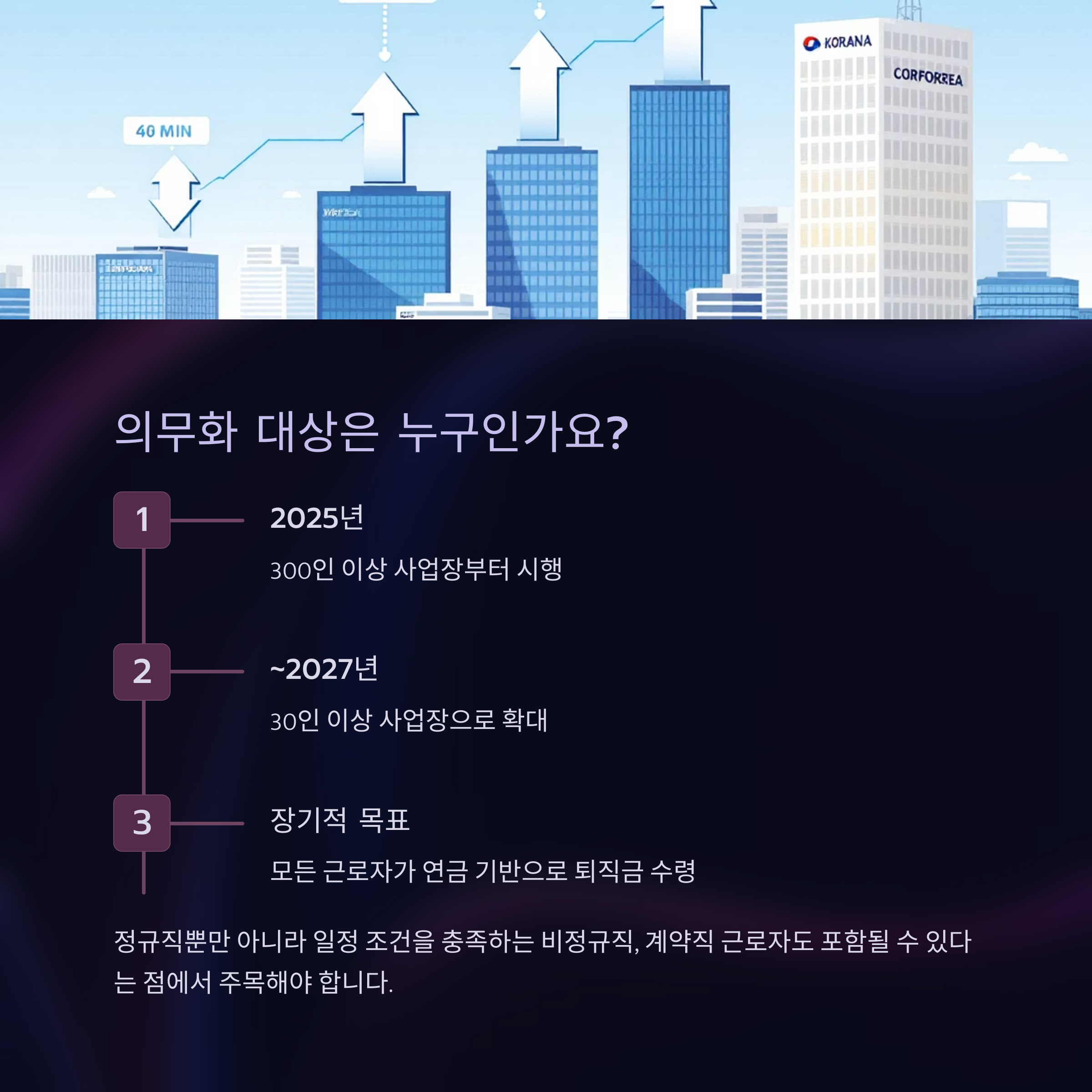 2025년 기준 퇴직금 연금 의무화는 먼저 일정 규모 이상의 사업장부터 시행됩니다. 초기에는 300인 이상 사업장을 대상으로 시작되며, 2027년까지 30인 이상 사업장으로 확대될 예정입니다. 특히 이번 개편에서는 정규직뿐만 아니라 일정 조건을 충족하는 비정규직, 계약직 근로자도 포함될 수 있다는 점에서 주목해야 합니다.