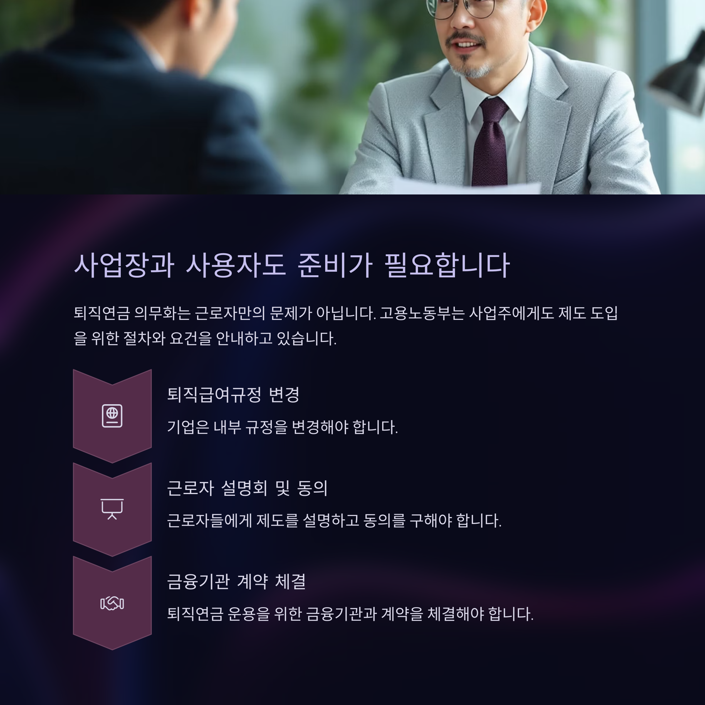 퇴직연금 의무화는 근로자만의 문제가 아닙니다. 고용노동부는 사업주에게도 제도 도입을 위한 절차와 요건을 안내하고 있습니다. 기업은 퇴직급여규정을 변경하고, 근로자 설명회 및 동의 절차를 거쳐야 하며, 금융기관과의 계약 체결도 병행해야 합니다.
