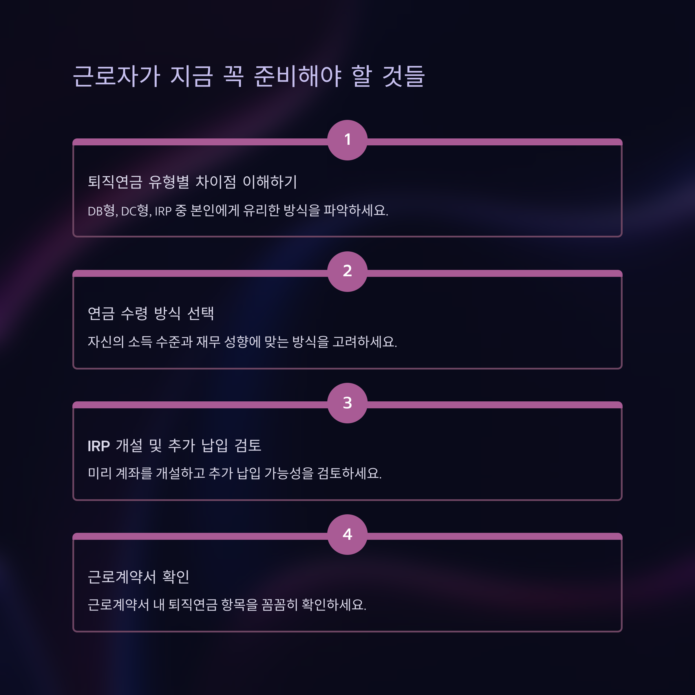 퇴직금 연금 의무화가 시행되면, 위 방식 중 하나를 사업장과 근로자가 선택하게 됩니다. 사업장은 제도 도입 준비를 해야 하며, 근로자 입장에서는 본인에게 유리한 유형을 미리 파악해두는 것이 필요합니다.