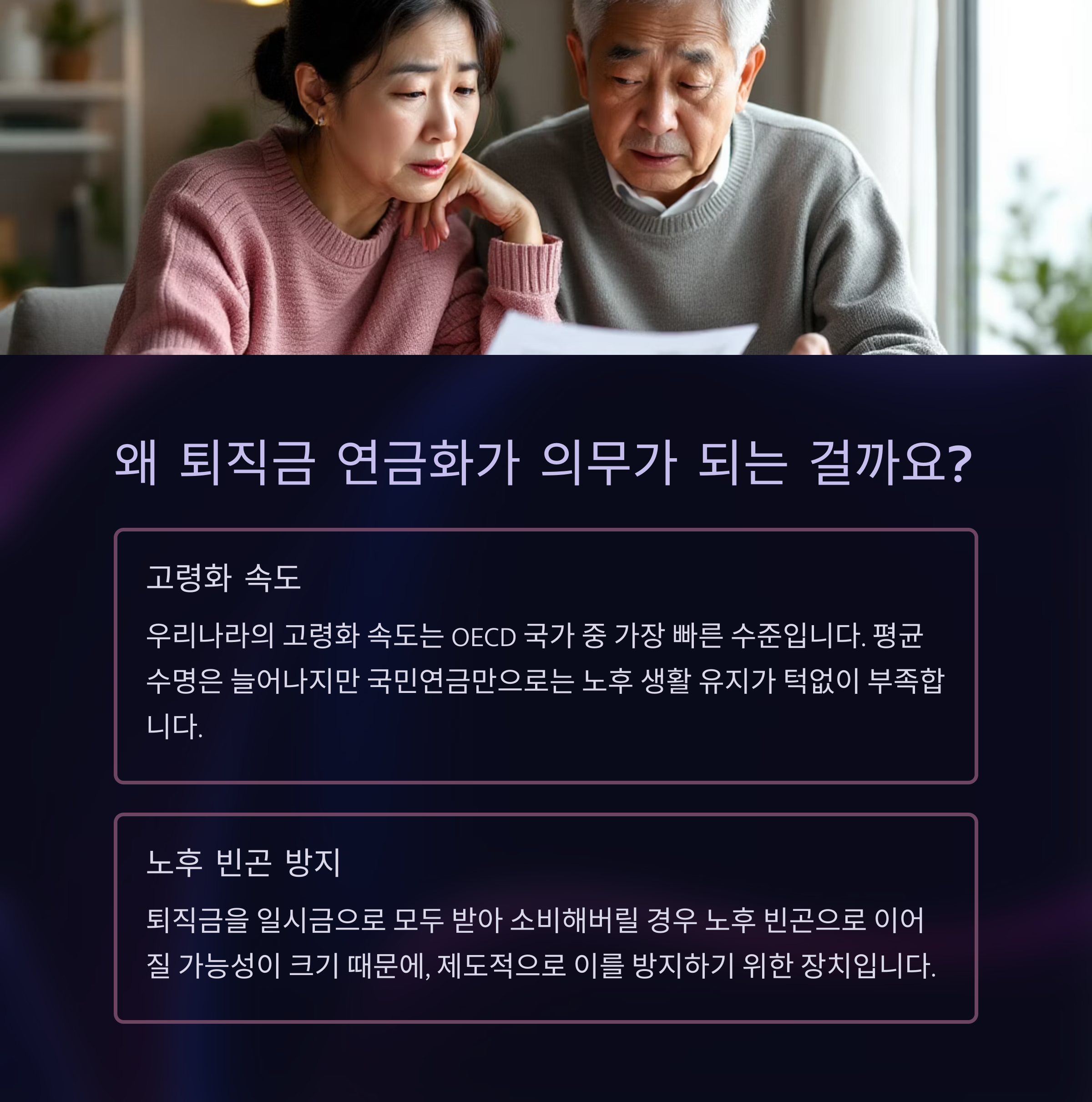 우리나라의 고령화 속도는 OECD 국가 중에서도 가장 빠른 수준입니다. 평균 수명은 늘어나고 있지만, 국민연금만으로 노후 생활을 유지하기에는 턱없이 부족하다는 것이 현실입니다. 이에 정부는 개인의 퇴직소득을 노후의 안정적인 현금 흐름으로 연결시키기 위해 퇴직금 연금화를 제도화하고 있습니다.