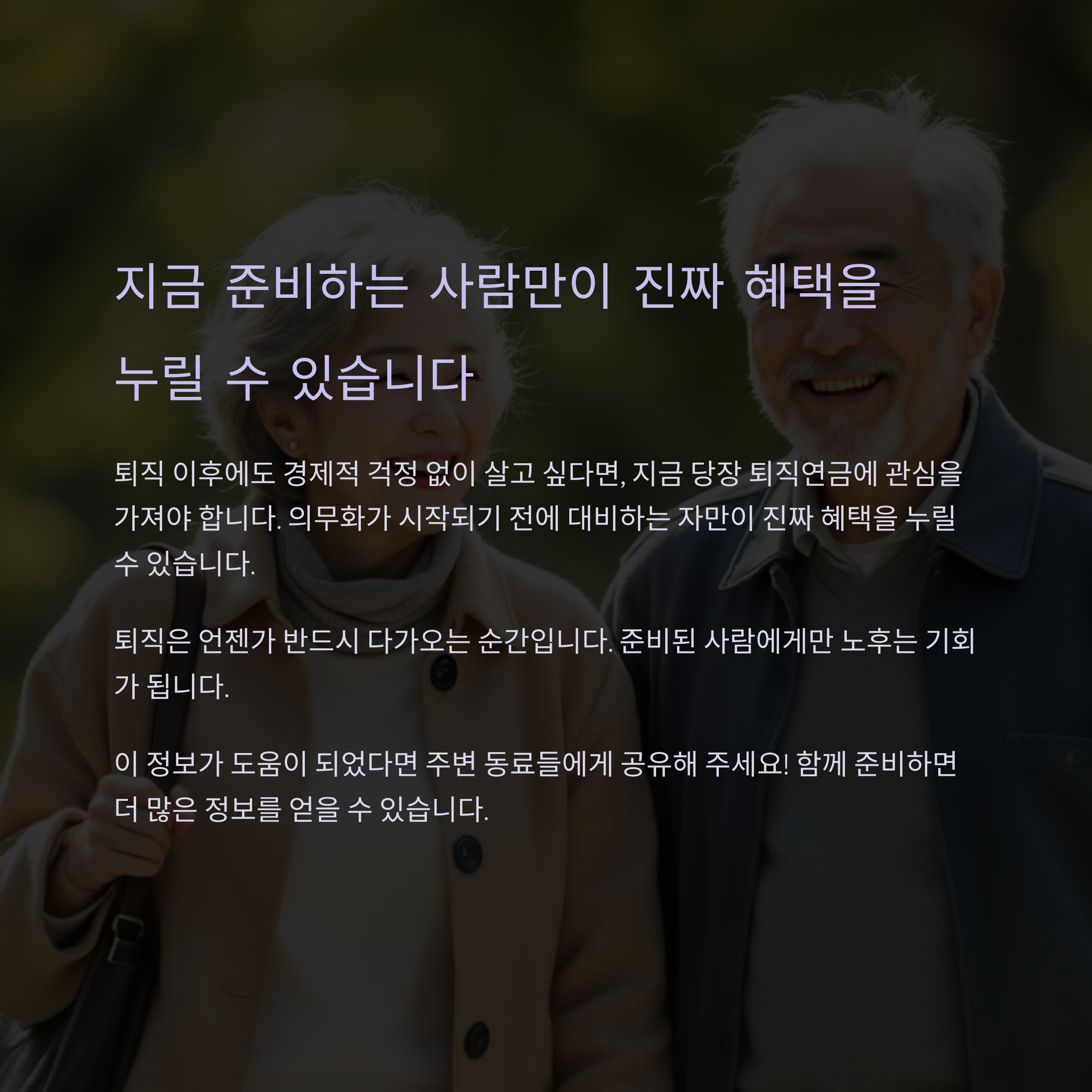 퇴직 이후에도 경제적 걱정 없이 살고 싶다면, 지금 당장 퇴직연금에 관심을 가져야 합니다. 의무화가 시작되기 전에 대비하는 자만이 진짜 혜택을 누릴 수 있습니다. 퇴직은 언젠가 반드시 다가오는 순간입니다. 준비된 사람에게만 노후는 기회가 됩니다.
